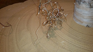 Sand Machine (above) was made using sand, shell, necklace, bamboo, wood, wire, motor and electric wiring. As the motor rotated the sculpture the wires at the bottom made perfectly circular patterns in the sand at the bottom. Again great fun and reminded me somewhat of the sand patterns made with pendulums that I used to get pupils to experiment with. Abstract art driven by scientific principles.